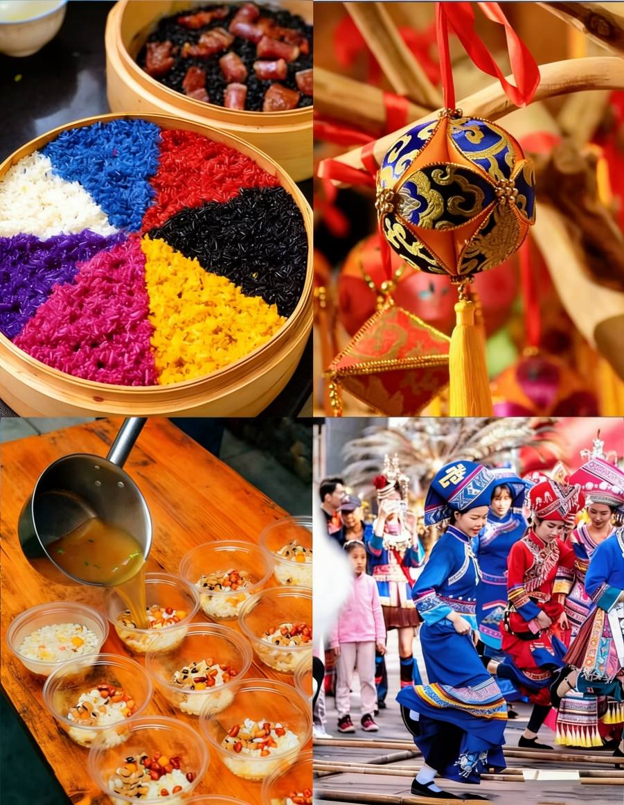 นอกจากการร้องเพลงแล้ว ผู้คนยังเฉลิมฉลองด้วยการเตรียมข้าวเหนียวห้าสีที่ย้อมด้วยน้ำพืช โยนลูกบอลปัก เต้นรำรำไม้ไผ่ และเล่นกลองทองสัมฤทธิ์